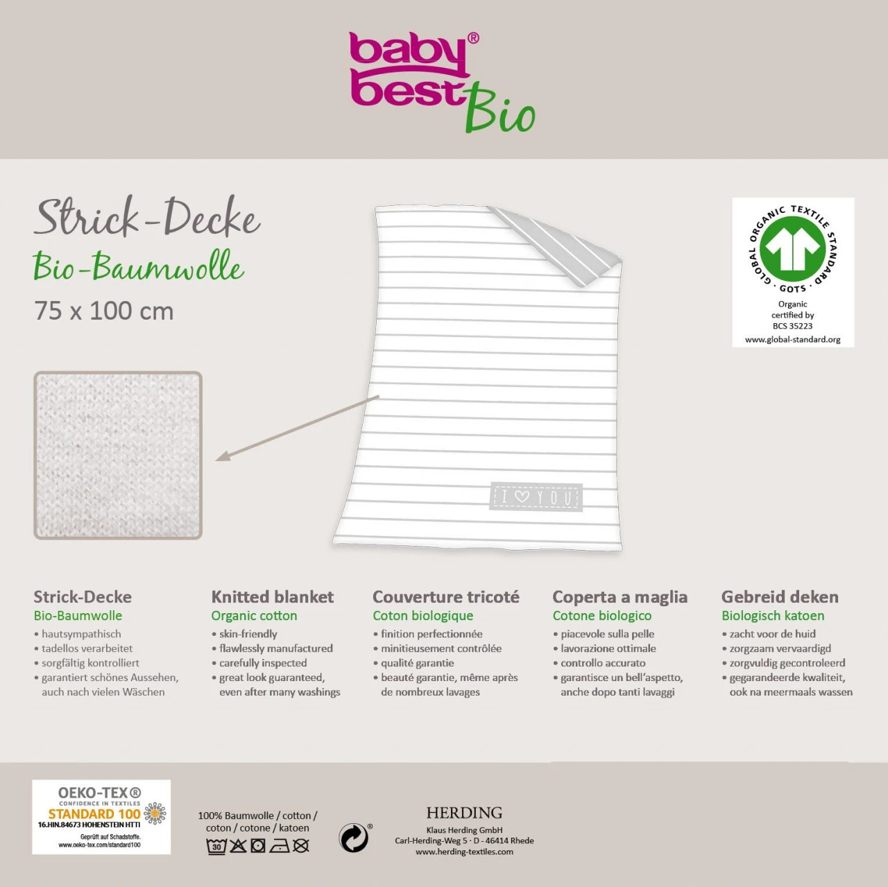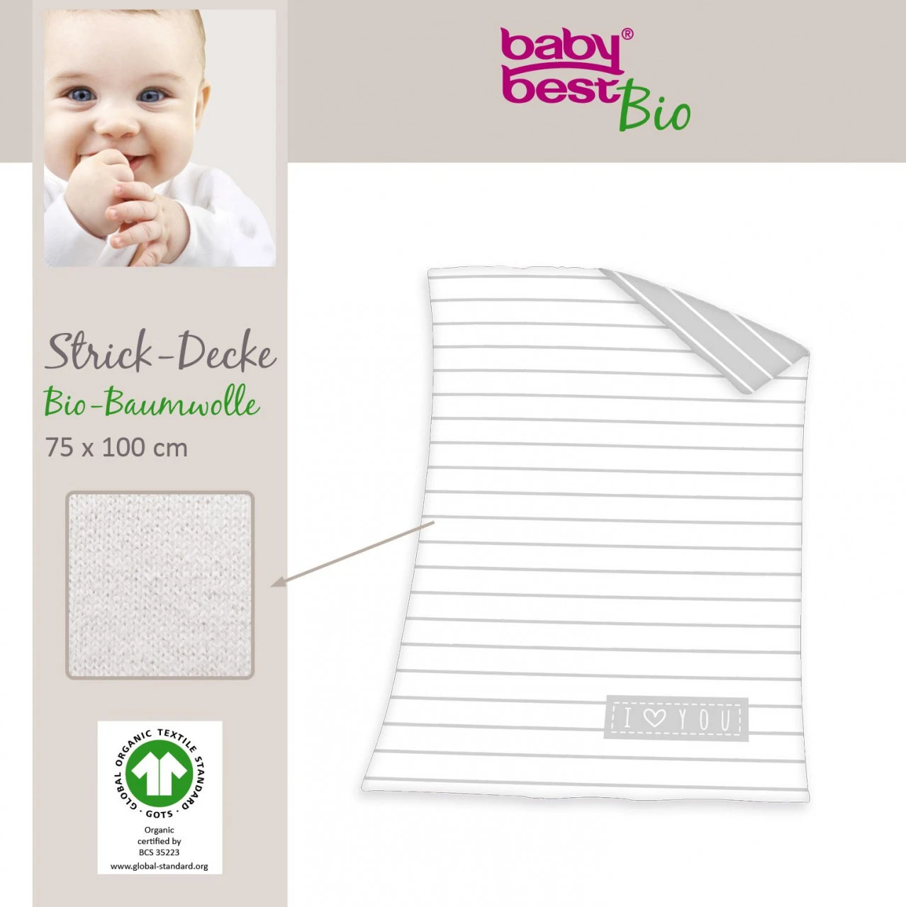 · Die super weiche babybest® Strick-Decke im liebevollen I love you Design vermittelt eine beruhigende und entspannende Wirkung in jedem Baby- und Kinderzimmer! Kontrolliert und äußerst nachhaltig aus 100 % GOTS Bio-Baumwolle gefertigt ist die sanfte, natürliche Qualität ebenfalls schadstoffgeprüft nach STANDARD 100 by OEKO-TEX® zertifiziert und eignet sich somit ideal für die zarte Baby- und Kinderhaut. Als langjähriger Begleiter kann sie vielseitig genutzt werden – zum Beispiel zum Schlafen oder Kuscheln und eignet sich besonders als Geschenk, – einfach nachhaltig, süß und langlebig. –