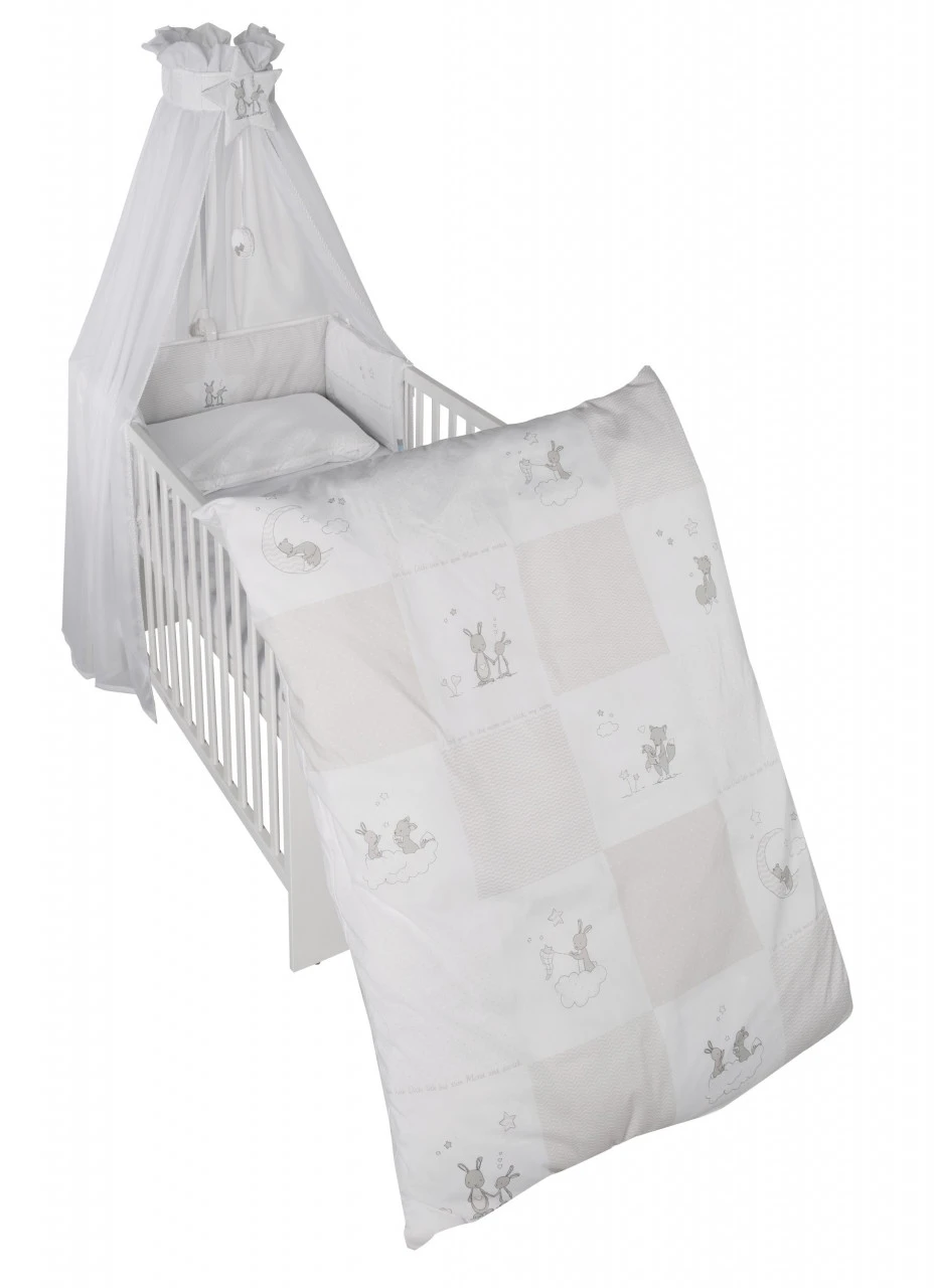 Das Bett-Set FOX amp BUNNY von besteht aus Bettwäsche, einem Nestchen und Himmel mit einem niedlichen Kindermotiv. Das Bettset ist mit einem Fox amp Bunny Design bedruckt, das verschiedene Szenen von Hasen und Füchsen zeigt. Das Set ist in dezenten Tönen gehalten und sorgt für ein beruhigendes und entspanntes Ambiente und einen entspannten Schlaf.