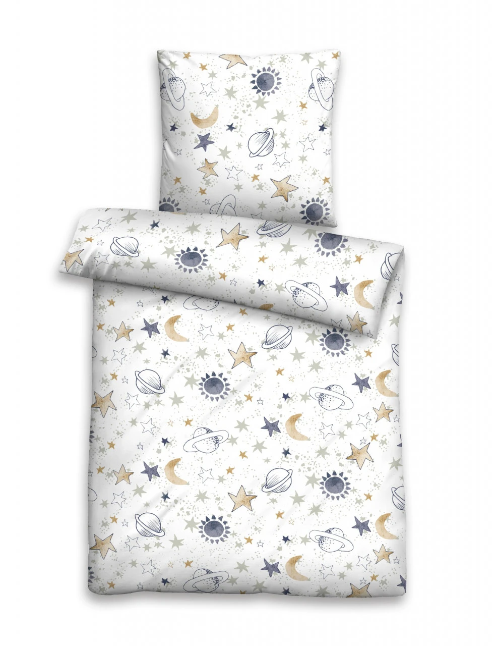 Die weiche Bettwäsche BIBER WEISS aus dem Hause TOM TAILOR wird Ihr Kind in gemütliche und ausgeruhte Nächte begleiten. Das niedliche Design ist dabei ein absoluter Hingucker und wird auch den Kleinsten gefallen. Die Bettwäsche ist aus 100% weicher Baumwolle gefertigt und mit einem Reißverschluss versehen. Das Motiv zeigt Planeten und ist damit ein echtes Highlight. Der Kissenbezug misst eine Größe von 40×60 cm und der Deckenbezug von 135×100 cm.