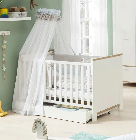 Kinderbett TIPPIETOE setzt schöne Akzente im Kinderzimmer. Durch den geradlinigen Stil passt das Bett in viele Einrichtungsstile. Gefertigt ist das Kinderbett aus einem mattweißen Design in Kombination mit Absetzungen in Asteiche. Damit schafft dieses Möbelstück eine attraktive Optik, die jeden Raum belebt. Das Bett verfügt über ein höhenverstellbares Lattenrost und Schlupfsprossen. Auf einer Liegefläche von 70 x 140 cm kann dein Liebling entspannt schlafen.