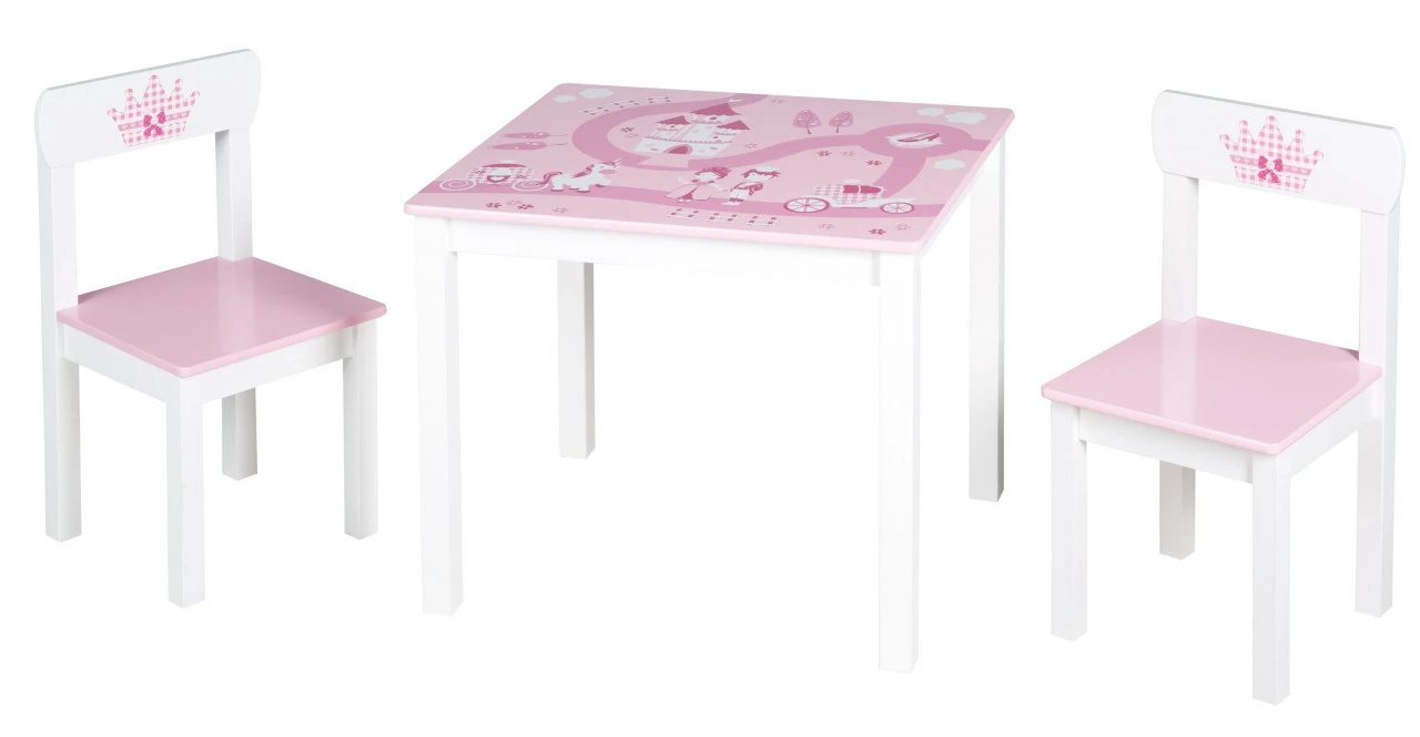 · Die 3-teilige Kindersitzgruppe Krone aus lackiertem und märchenhaft bedrucktem MDF ist ideal auf die Sitzbedürfnisse von 2- bis 10-jährigen Kindern zugeschnitten. Sie besteht aus einem formschönen Kindertisch und zwei passenden Stühlen in zartem Weiß und Rosa. Ihr aktiver Nachwuchs kann an der roba Kindersitzgruppe schon von klein auf bequem und komfortabel am Tisch sitzen, essen, spielen, malen und basteln.Mit den Produkten von roba können Kinder ihre Welt entdecken und viele schöne gemeinsame Momente mit ihren Eltern und Spielgefährten