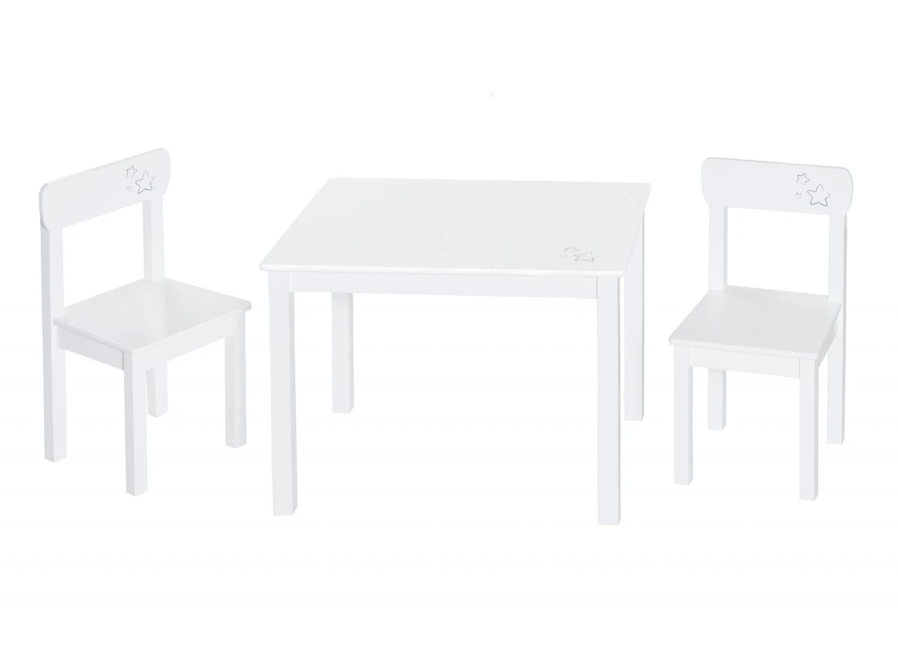 · Die 3-teilige Kindersitzgruppe Little Stars aus lackiertem und mit Sternen bedrucktem MDF ist ideal auf die Sitzbedürfnisse von 2- bis 10-jährigen Kindern zugeschnitten. Sie besteht aus einem formschönen Kindertisch und zwei passenden Stühlen. Ihr aktiver Nachwuchs kann an der roba Kindersitzgruppe schon von klein auf bequem und komfortabel am Tisch sitzen, essen, spielen, malen und basteln. Kinder werden ihre liebevoll bedruckte Sitzgarnitur lieben- Die Kindergarnitur ist nach Norm EN71-1:2014 produziert und wird zerlegt geliefert. Alle verwendeten Materialien sind schadstoffgeprüft und zertifiziert. Zusätzlich werden sie regelmäßig während der Herstellung überprüft. Die Oberflächen sind abwischbar und pflegeleicht. Die Aufbaumaße der Stühle mit einer Sitzhöhe von 31 cm betragen 58x29x29 cm (HxBxT), die des Tisches 52,5×67,5×51 cm (HxBxT).