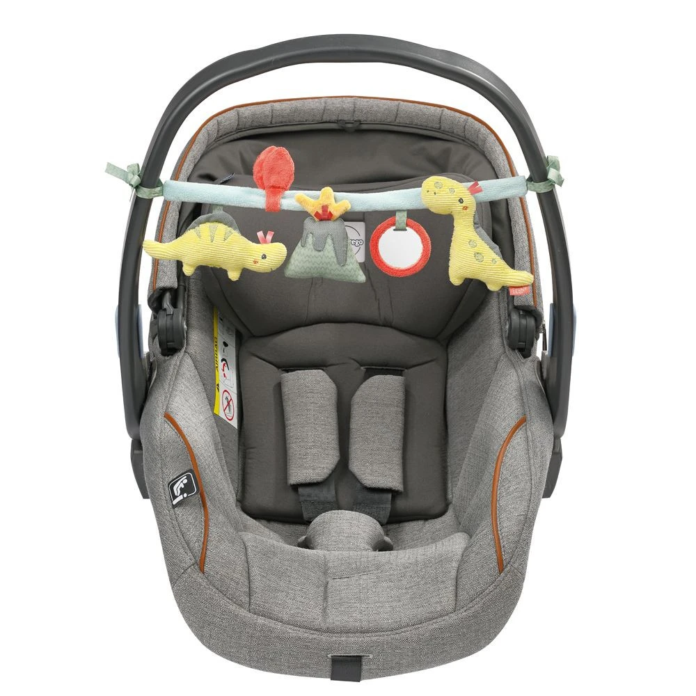· Die Kinderwagenkette Happy Dino wird garantiert zum Liebling des Babys! Die niedlichen Dinosaurier laden mit Tierstimme, Raschelpapier, Spiegel, Rassel & Quietsche zum Greifen und Fühlen ein, fördern erste Hand-Auge-Koordination und unterstützen spielerisch die Selbstwahrnehmung. Mit den beiden Klemmen ist die Spielkette schnell an Kinderwagen, Babyschale, Bettchen, Wiege oder Spielbogen befestigt und sorgt für spannenden Lernspaß zuhause und unterwegs.