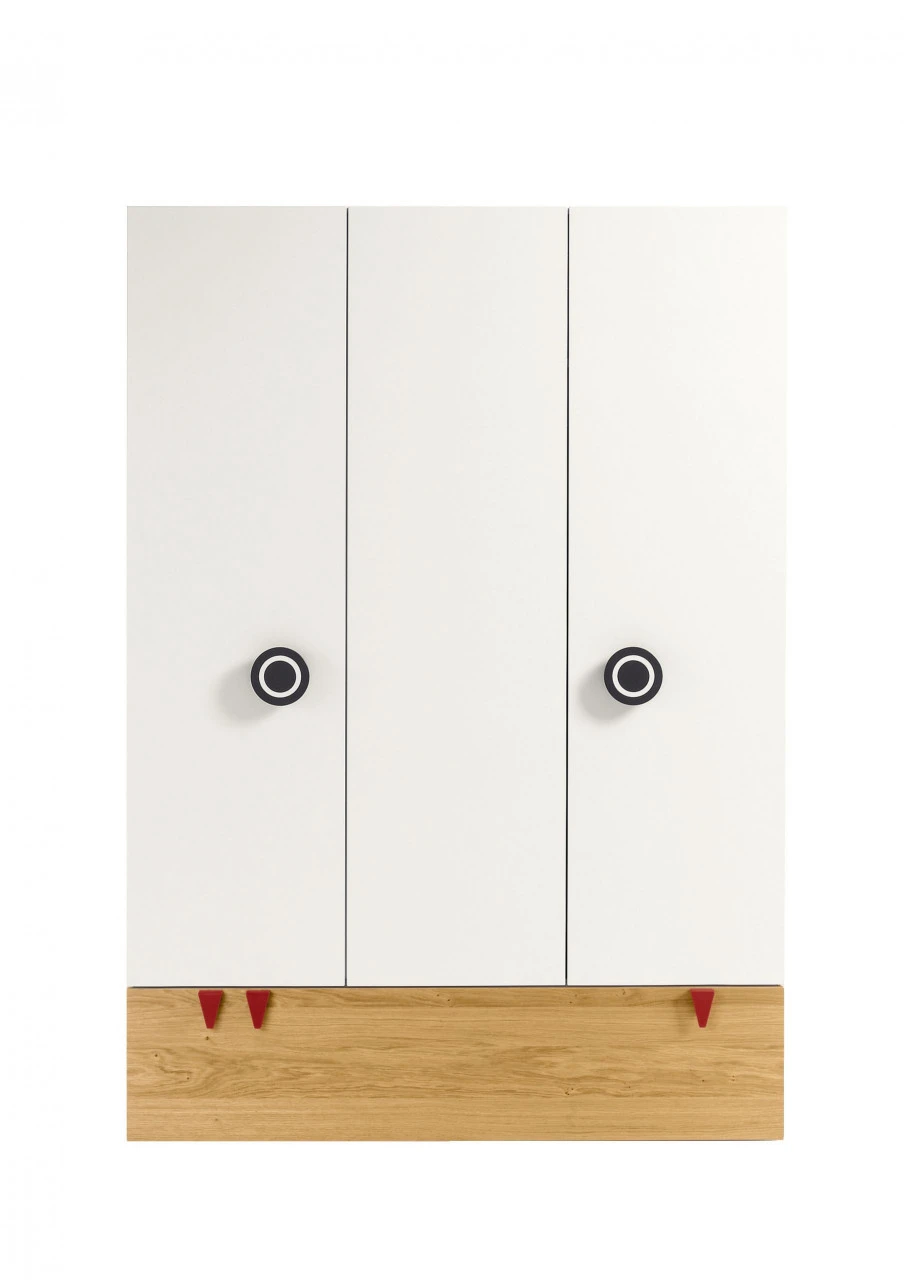 Der Kleiderschrank MINIMO der Trendmarke now! by hülsta überzeugt mit einem verspielten, aktuellen Design und einer hochwertigen Verarbeitung. Der Kleiderschrank ist aus robustem Dekor gefertigt und verfügt über drei Türen, fünf Einlegeböden, eine Kleiderstange und einen geräumigen Schubkasten mit Vollauszug und angenehmer Soft-Close-Funktion. Rote, dreieckige und zwei schwarze, runde Griffe stehen in ansprechendem Farb- und Formkontrast zu dem weißen Korpus und der Schubladenfront aus heller Natureiche. MINIMO bietet großzügigen Platz um die gesamte Kleidung strukturiert und übersichtlich zu verstauen.