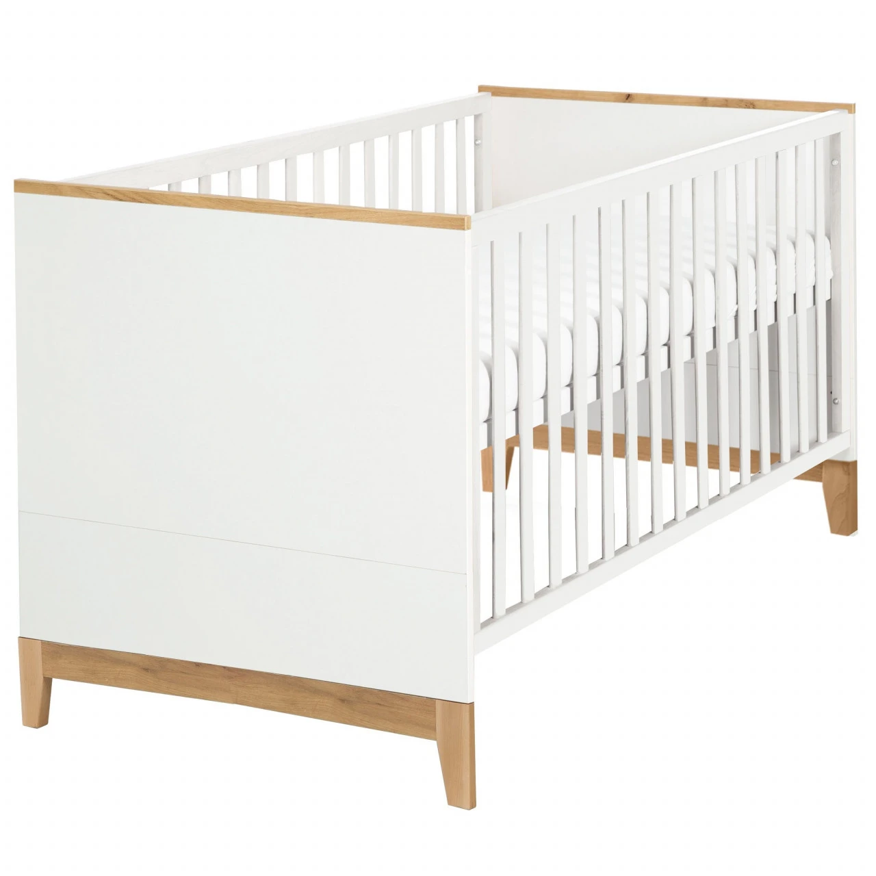 · Das Kombi-Kinderbett Finn ist mit seiner zweifarbigen Optik im Dekor Goldeiche und Weiß das Highlight im Baby- oder Kinderzimmer. Das mitwachsende Kinder- und Babybett begleitet Ihr Baby von Geburt an bis es in die Schule kommt. Als besonders rückenschonend für Sie als Eltern erweist sich die obere Liegeposition des 3-fach höhenverstellbaren Gitterbetts. Aus dieser Liegehöhe können Sie ihr Baby mühelos aus dem Bettchen heben. Später ist die mittlere Position die perfekte Wahl, denn mittels der 3 herausnehmbaren Schlupfsprossen im Gitterelement des Babybetts ermöglichen Sie Ihrem Kleinkind den sicheren Ein- und Ausstieg. Die unterste Position des höhenverstellbaren Kinderbetts ist für das Juniorbett vorgesehen. Ist ihr Baby dann größer, lässt sich das Kombi-Kinderbett mit den mit separat erhältlichen Umbauseiten in ein Juniorbett umbauen. Kopf- und Fußteil des Kombi-Kinderbetts sind teilbar. Beim Umbau zum Juniorbett kommen die oberen beiden Hälften des Kopf- und Fußteils zum Einsatz und sorgen für einen neuen Look im Kinderzimmer. Das Kombi-Kinderbett Finn findet bis zum 7. Lebensjahr Ihres Kindes (bzw. bis zu einem Körpergewicht von 50 kg) Verwendung. Das Kinder- und Juniorbett hat die Liegefläche 70 x 140 cm. Wenn Sie das Babybett in ein Himmelbett verwandeln möchten, bieten sich unsere 4-teiligen Kinderbettgarnituren bestehend aus Kissen, Decke, Himmel und Nestchen an. Das Kombi-Kinderbett ist in Deutschland entwickelt und entspricht den aktuellen Sicherheitsstandards nach EN 716 ? 1:2017 + AC:2019. Das Gitterbett wurde in der EU produziert und ist montagefreundlich. Zusätzlich ist es eph zertifiziert und trägt das Qualitätssiegel blauer Engel, das garantiert, dass alle verwendeten Materialien höchste Ansprüche an Umwelt-, Gesundheits- und Gebrauchseigenschaften erfüllen.