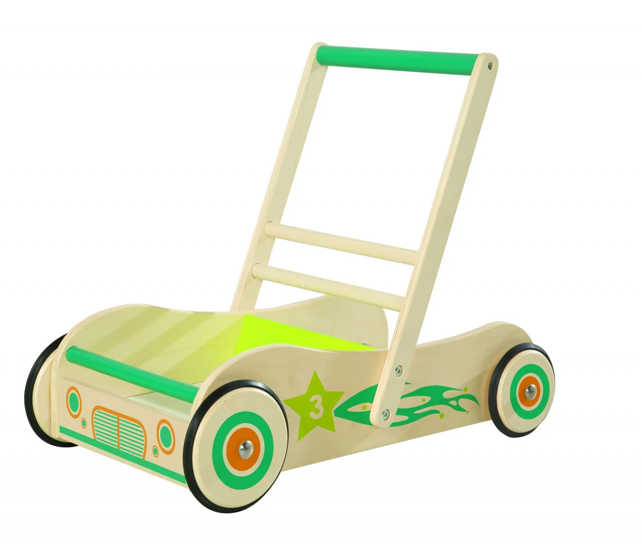 · Der roba Lauflernwagen ist aus robusten Massiv-Holz mit lustiger Auto-Bedruckung gefertigt. Der Spiel- & Lauflernwagen mit praktischer Bremse hat eine individuell einstellbare Bremswirkung für Babys sichere erste Schritte. Der Schiebewagen hilft Laufanfängern ab 12 Monaten beim Hochziehen, Festhalten und Stützen und gibt Halt bei den ersten, noch unsicheren Schritten bis hin zum selbstständigen Laufen. Kippsicher durch die verlängerten Seiten und perfekt auf die ergonomischen Bedürfnisse von Kindern zugschnitten fördert der Laufwagen Motorik, Bewegungsdrang und das Selbstbewußtsein von Kleinkindern. (Griffhöhe 45 cm, B x L: 29 x 56 cm) Die Gehlernhilfe ist leicht zu montieren. Die Bremse an den Vorderreifen kann jederzeit einfach wieder nachjustiert und perfekt auf die Bedürfnisse und Schnelligkeit des Kindes angepasst werden. Die Lauflernhilfe kann sowohl als Puppenwagen für Mädchen, als auch als tolles Auto zum Befüllen mit Bauklötzen eingesetzt werden und ist belastbar bis 15 kg. Die leichtgängige Gummibereifung auf Holzfelgen ist für den Innen- & Außenbereich geeignet, sicher und kratzfrei auf Parkettböden. Alle verwendeten Materialien sind schadstoffgeprüft und zertifiziert. Zusätzlich werden sie regelmäßig während der Herstellung überprüft. Die Oberflächen sind abwischbar und pflegeleicht.
