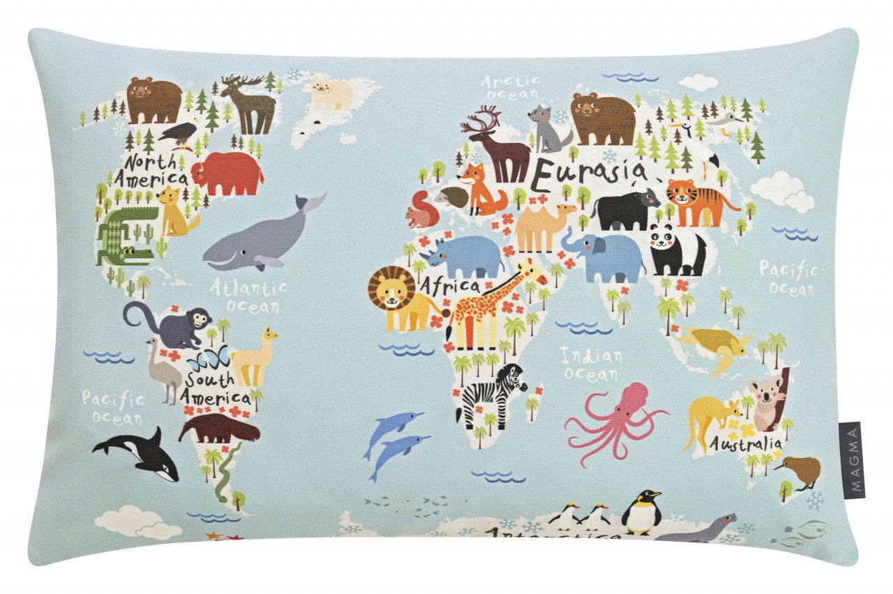 Eine gemütliche Atmosphäre im Kinderzimmer erzeugt das Kissen WORLD aus dem Hause Magma. Das weiche Kissen präsentiert sich in einem modernen Stil und sorgt für einen komfortablen Liege- und Sitzgenuss auf diversen Möbeln. Es besteht aus weichem Polyester und seine hellblaue Farbgebung ist mit verschiedenen Tiermotiven bedruckt. Zudem trägt das Kissen zu einem behaglichen Ambiente bei und rundet die Einrichtung ab. Es hat eine Größe von BH 40×60 cm.