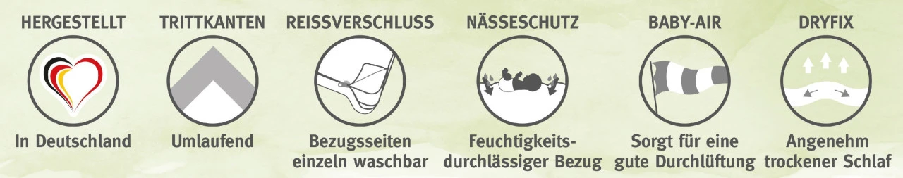 · mit Nässeschutz für eine bessere Feuchtigkeitsableitung und für eine noch schneller trocknende Liegefläche