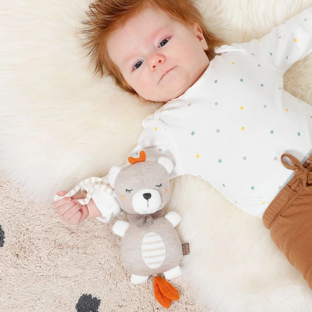 · Der niedliche Teddy mit Spieluhr aus der fehnNATUR Kollektion ist nicht nur ein toller erster Freund für Babys von Geburt an, sondern tröstet und beruhigt mit seiner sanften Einschlafmelodie ?Schlaf Kindlein Schlaf?. Die moderne Form des kleinen Schlafbegleiters passt perfekt in kleine Babyhände und dank der beiden Befestigungsbänder ist der liebenswerte Strick-Teddy zuhause und auch unterwegs schnell festgebunden an Bettchen, Babyschale oder Kinderwagen. Die nachhaltigen Materialien und die Füllung aus 100% Bio-Baumwolle aus kontrolliertem und zertifiziertem Anbau machen das Kuscheln, Träumen und Liebhaben zu einem besonderen Vergnügen.