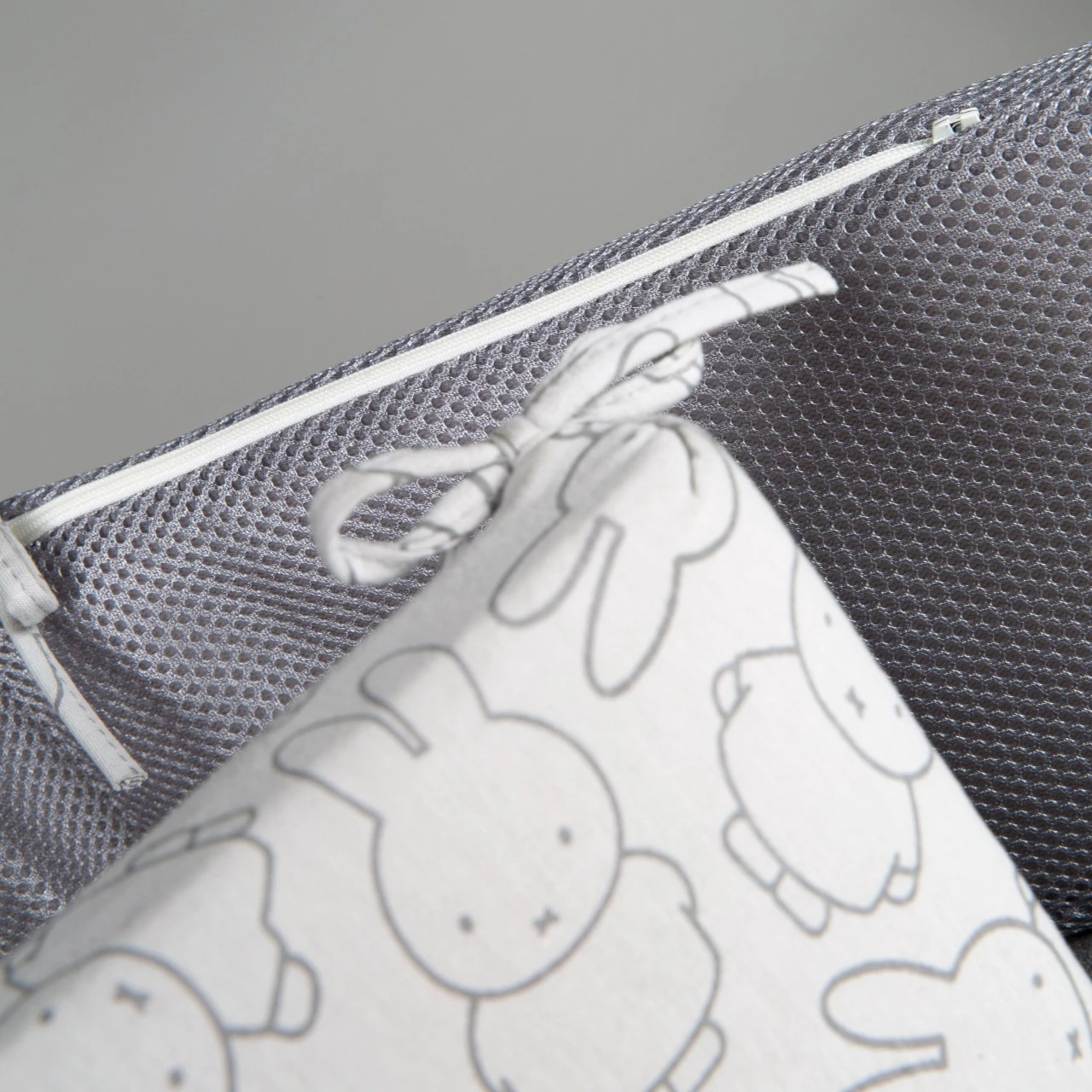 · Das roba Nestchen Air PLUS aus Serie ?safe asleep? im niedlichen Miffy-Design ist mit dem AIR-Balance System ausgestattet, das wie eine natürliche Klimaanlage wirkt. Das AIR-balance System verbessert die natürliche Luftzirkulation und sorgt für einen Temperaturausgleich, wodurch ein gefährlicher Hitze- und Feuchtigkeitsstau vermieden wird. Das AIR-balance System sorgt so für ein gesundes und angenehmes Wohlfühlklima. Kuscheltiere, Kissen und Decken sind zwar schön anzusehen, gefährden jedoch die Sicherheit des Babys während des Schlafs. Deshalb sollte auf Dekoration, Spielzeug, Kopfkissen, Federbetten, oder Felle im Babybett verzichtet werden. Das besonders luftdurchlässige atmungsaktive Mesh-Material des Nestchens vermindert die CO2-Rückatmung und ermöglicht eine optimale Luftzufuhr, wodurch die Gefahr einer Überhitzung minimiert wird. Zusätzlich polstert das flache Nestchen die Gitterstäbe im Kopfbereich des Babybettchens ab und sorgt dafür, dass die kleinen Gliedmaßen des Babys im Inneren des Bettchens bleiben. Das safe asleep® Nestchen kann mit Stoffbändern am Babybett fixiert werden, so dass Ihr Baby sich darin weder einwickeln noch damit bedecken kann. Das roba Nestchen Air PLUS ist besonders flach und weich gepolstert. Mit dem safe asleep Nestchen fühlen sich Babys geborgen und können sicher und gesund schlafen.