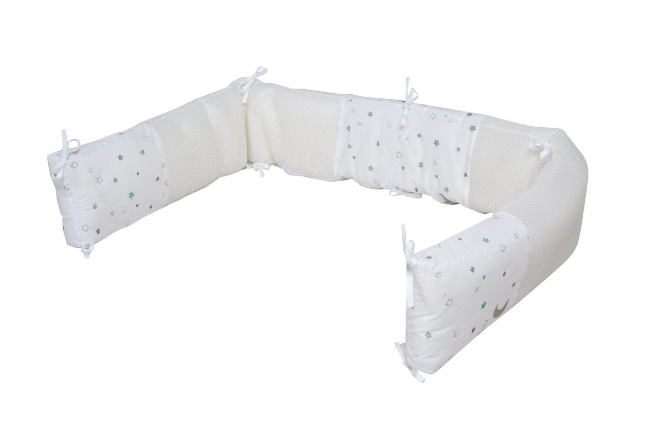 · Das roba Nestchen Easy Air aus Serie Safe Asleep im niedlichen Sternenzauber-Design ist mit dem AIR-Balance System ausgestattet, das wie eine natürliche Klimaanlage wirkt. Das AIR-balance System verbessert die natürliche Luftzirkulation und sorgt für einen Temperaturausgleich, wodurch ein gefährlicher Hitze- und Feuchtigkeitsstau vermieden wird. Das AIR-balance System sorgt so für ein gesundes und angenehmes Wohlfühlklima. Kuscheltiere, Kissen und Decken sind zwar schön anzusehen, gefährden jedoch die Sicherheit des Babys während des Schlafs. Deshalb sollte auf Dekoration, Spielzeug, Kopfkissen, Federbetten, oder Felle im Babybett verzichtet werden. Das besonders luftdurchlässige atmungsaktive Mesh-Material des Safe Asleep Nestchens vermindert die CO2-Rückatmung und ermöglicht eine optimale Luftzufuhr, wodurch die Gefahr einer Überhitzung minimiert wird. Zusätzlich polstert das flache Nestchen die Gitterstäbe im Kopfbereich des Babybettchens ab und sorgt dafür, dass die kleinen Gliedmaßen des Babys im Inneren des Bettchens bleiben. Das safe asleep® Nestchen kann mit Stoffbändern am Babybett fixiert werden, so dass Ihr Baby sich darin weder einwickeln noch damit bedecken kann. Das roba Nestchen Easy Air ist besonders flach und weich gepolstert. Mit dem Safe Asleep Nestchen fühlen sich Babys geborgen und können sicher und gesund schlafen.