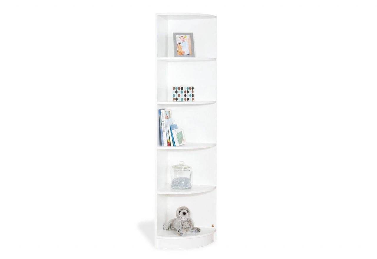 Modernes Eckregal von für das Kinderzimmer. Ausgestattet mit vier Einlegeböden, in weißem Dekor bietet das Regal Platz zum Aufbewahren von Spielzeug, Büchern und Deko. Das Eckregal in weißem Dekor passt sich ideal jedem Kinderzimmer an. Es lässt sich wahlweise rechts oder links an den Schrank anbauen.