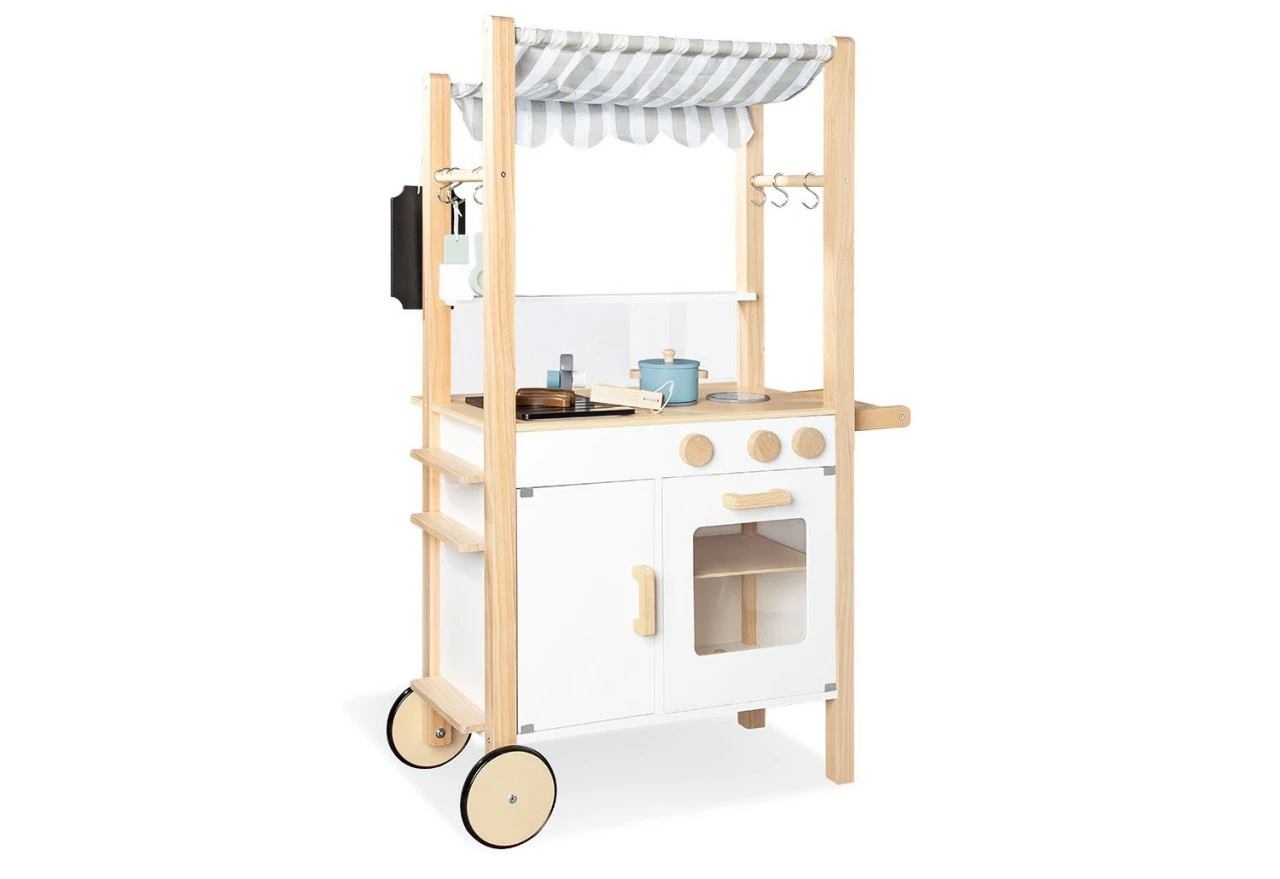 · Das Ofenblech lässt sich herausnehmen und als Backblech verwenden. Das Kochbesteck kann an kleinen Haken aufgehängt werden, damit es beim Schieben der Küche nicht herunterfällt. Auf schmalen Regalböden können die zubereiteten Leckereien präsentiert werden.