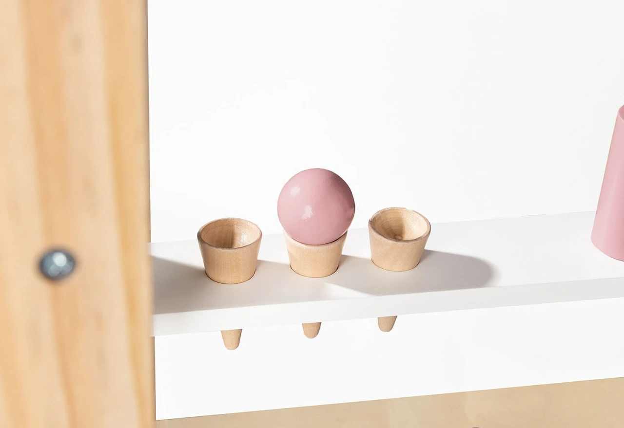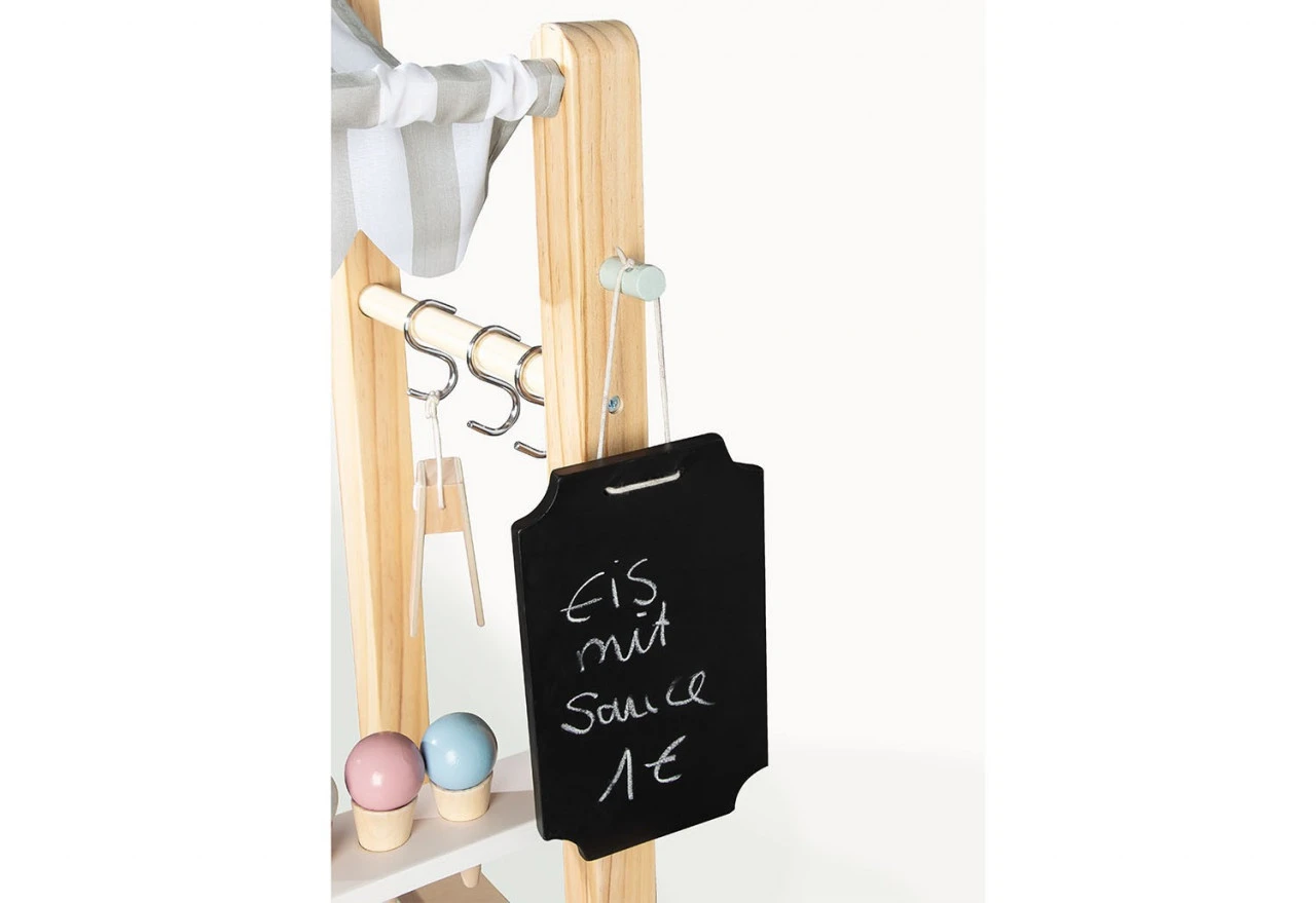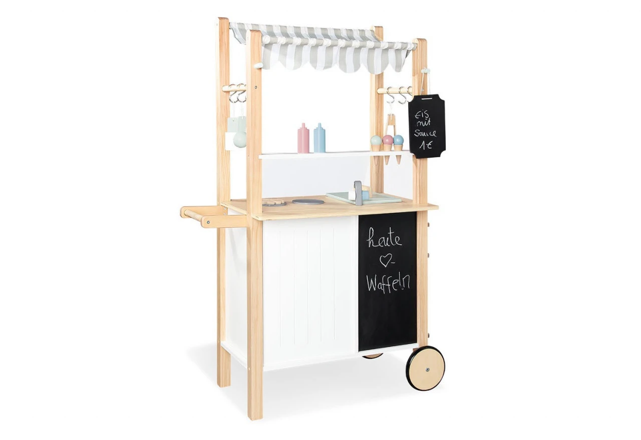 · Wird der Deckel über die Spüle gelegt, kann die Küche als Eiswagen genutzt werden. Halterungen für die Eistüten befinden sich in der oberen Ablage. Alternativ lässt sich auch eine Grillplatte über die Spüle legen, sodass Würstchen gebraten werden können.