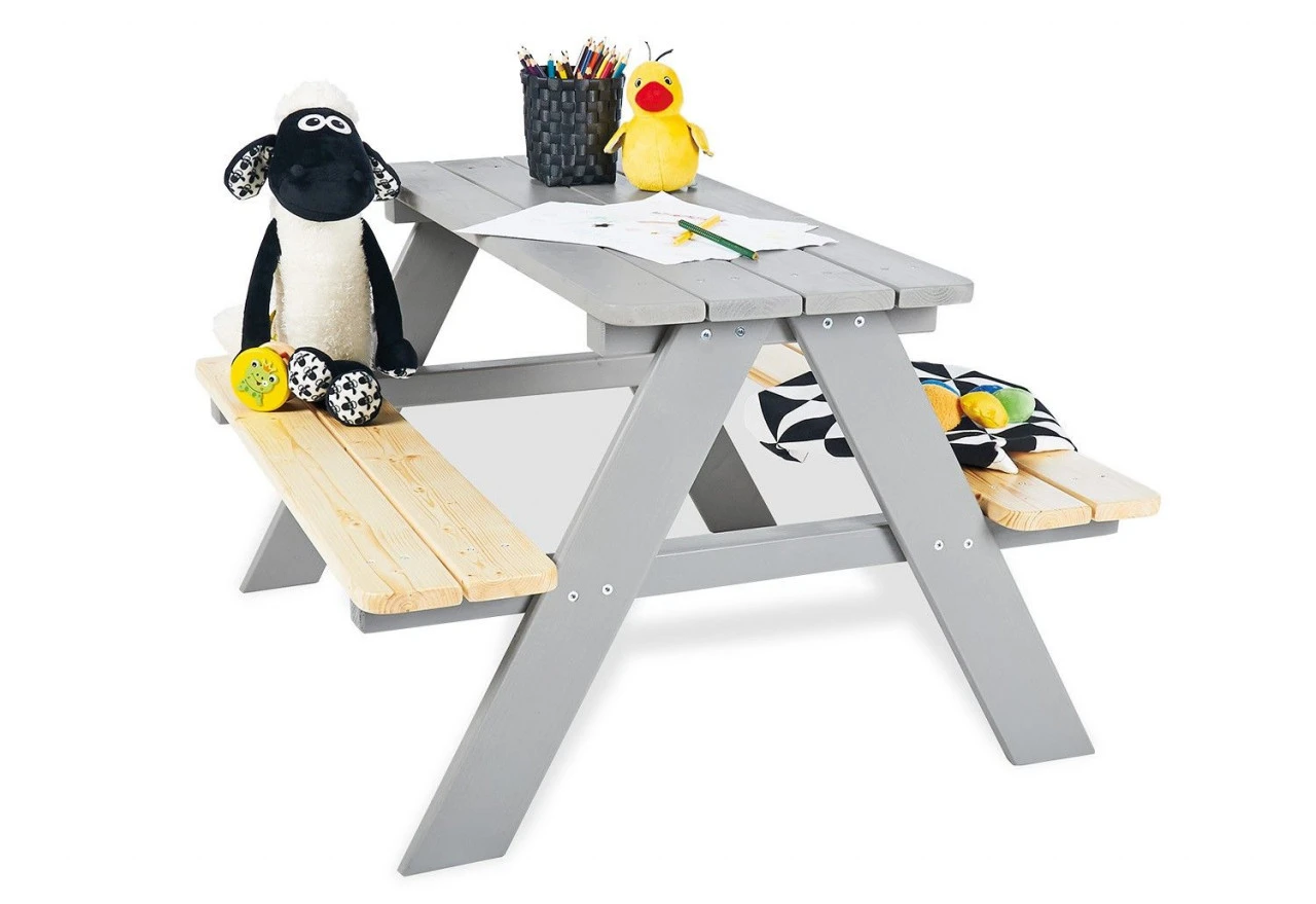 Kindersitzgarnitur Nicki von aus vollmassivem, grau und klar lasiertem Fichtenholz, für bis zu vier Kinder. Die hochwertige Kindersitzgarnitur, mit einem Tisch und zwei Bänken ist perfekt für alle Aktivitäten. Ob draußen oder drinnen: zum Malen, Spielen oder für ein schönes Picknick mit Freunden ist diese Garnitur perfekt geeignet.