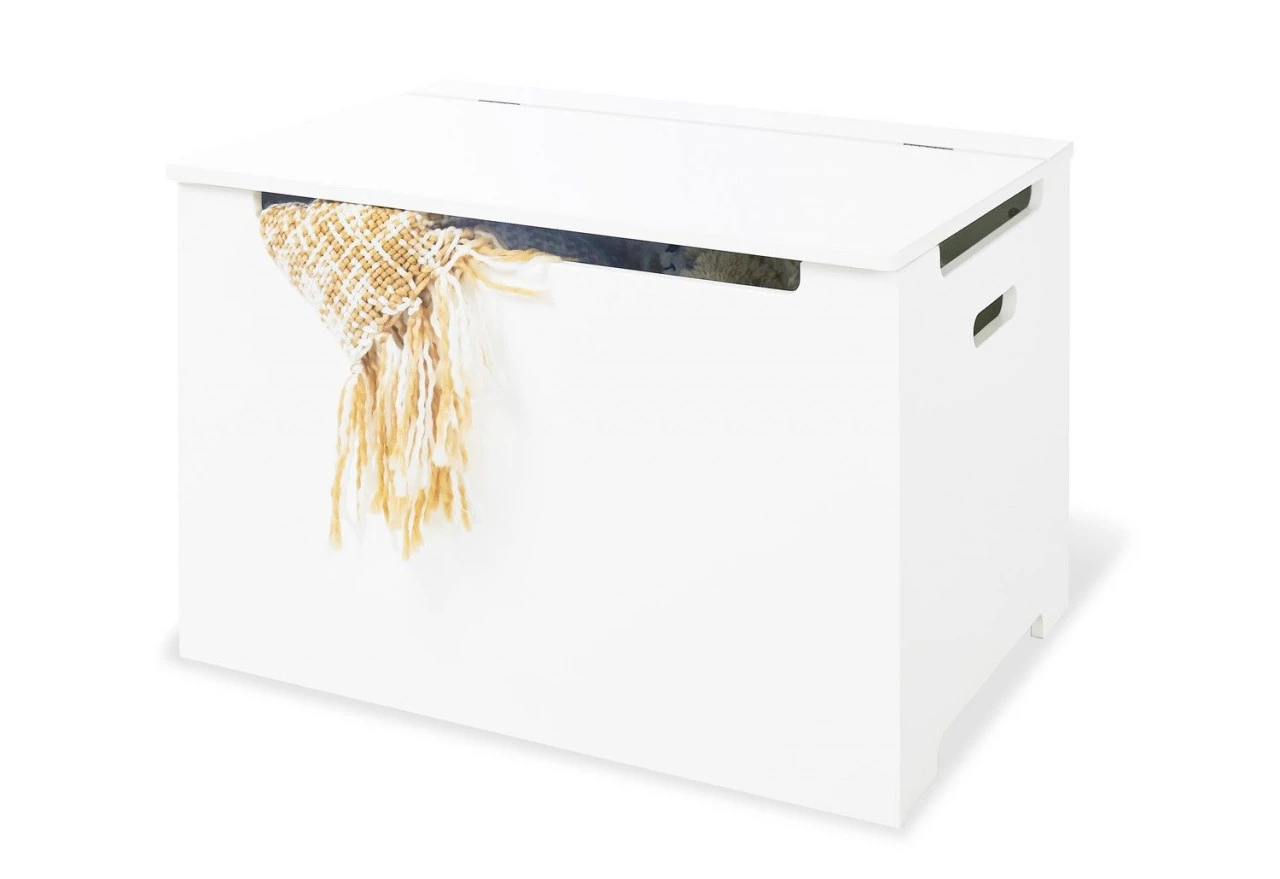 Moderne und stilvolle Truhe von aus weiß lackiertem MDF. Der Deckel ist mit Klappendämpfer ausgestattet und kann so schonend geschlossen werden. So macht Ordnung Spaß! Die praktische Truhe bietet reichlich Stauraum für alle Spielsachen und Kuscheltiere und ist passend zu vielen Kinderzimmerserien von Pinolino.