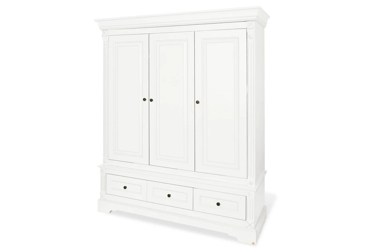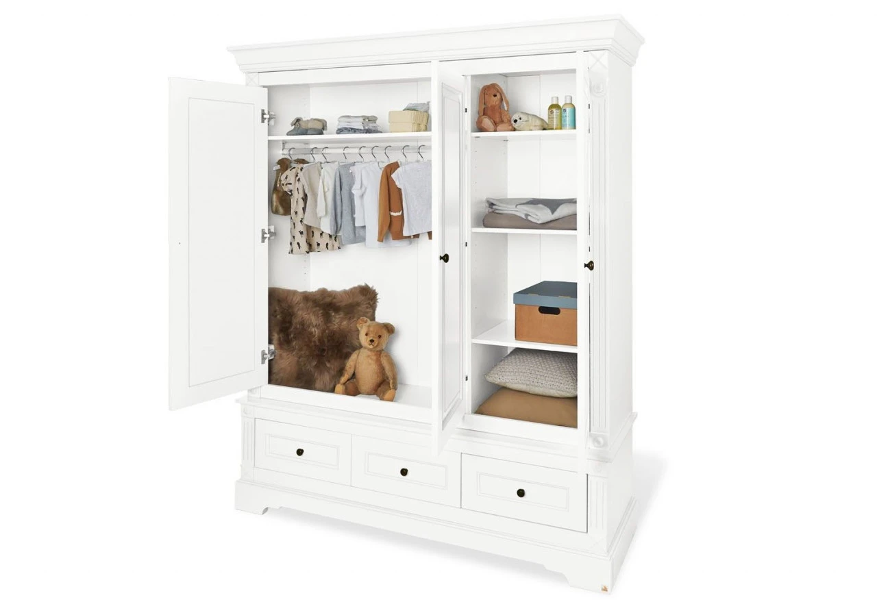 Der Kleiderschrank Emilia von besticht durch seine traumhafte Optik. Mit 3 Türen und 3 Schubkasten bietet er jede Menge Platz für alles, was im Kinderzimmer verstaut werden muss. Der romantische Kleiderschrank besteht aus edelmatt lackiertem MDF in uni weiß.