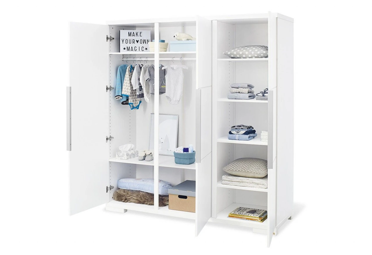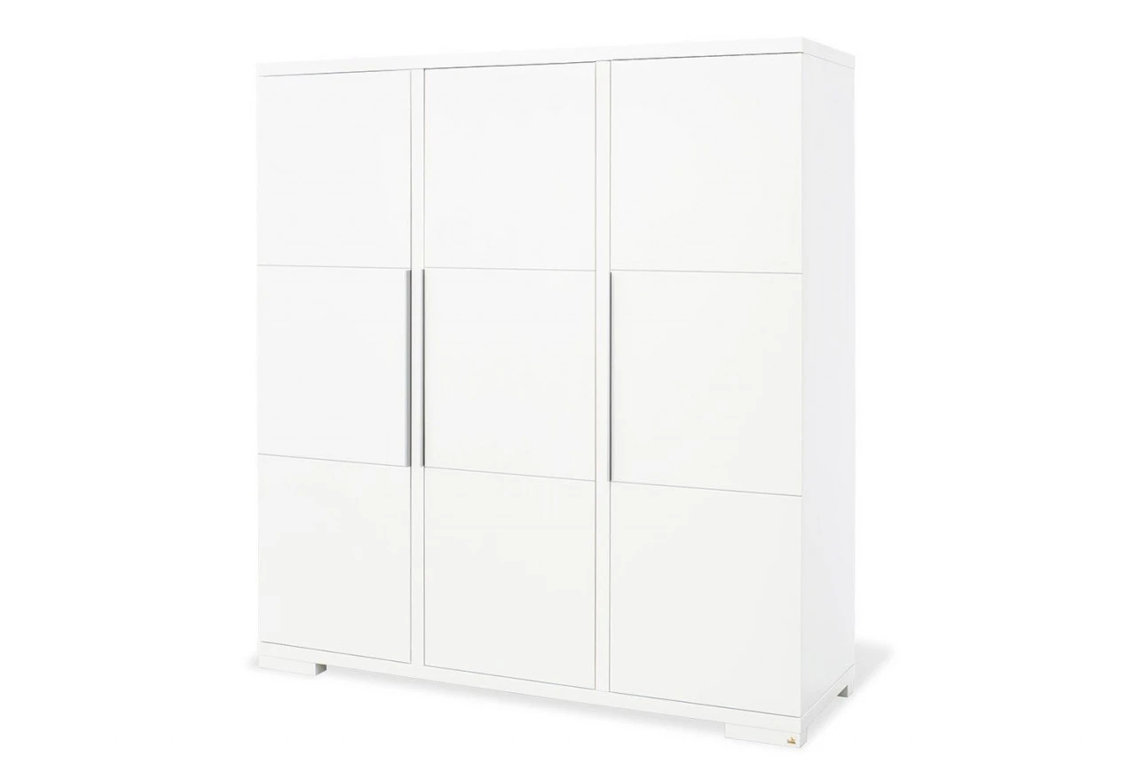 Der große Kleiderschrank Polarüberzeugt durch sein puristisches Design und bietet mit seinen drei Türen jede Menge Stauraum im Kinderzimmer. Dieser geräumige Kleiderschrank besteht aus edelmatt lackiertem MDF in uni weiß.