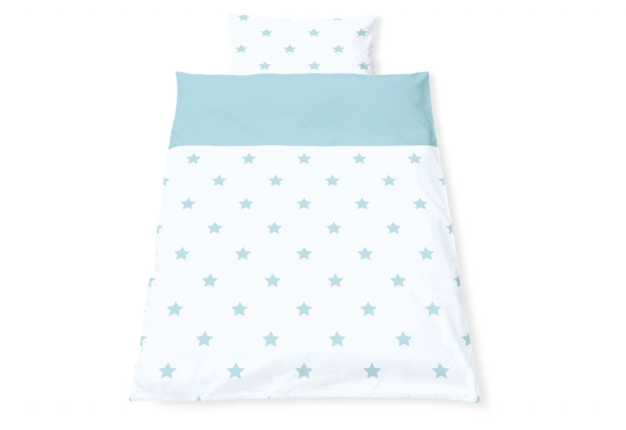 Des. Sternchen -hellblau- 2-tlg. 100 % Baumwolle Bezug: 100 x 135 cm Kissen: 40 x 60 cm bei 60° waschbar