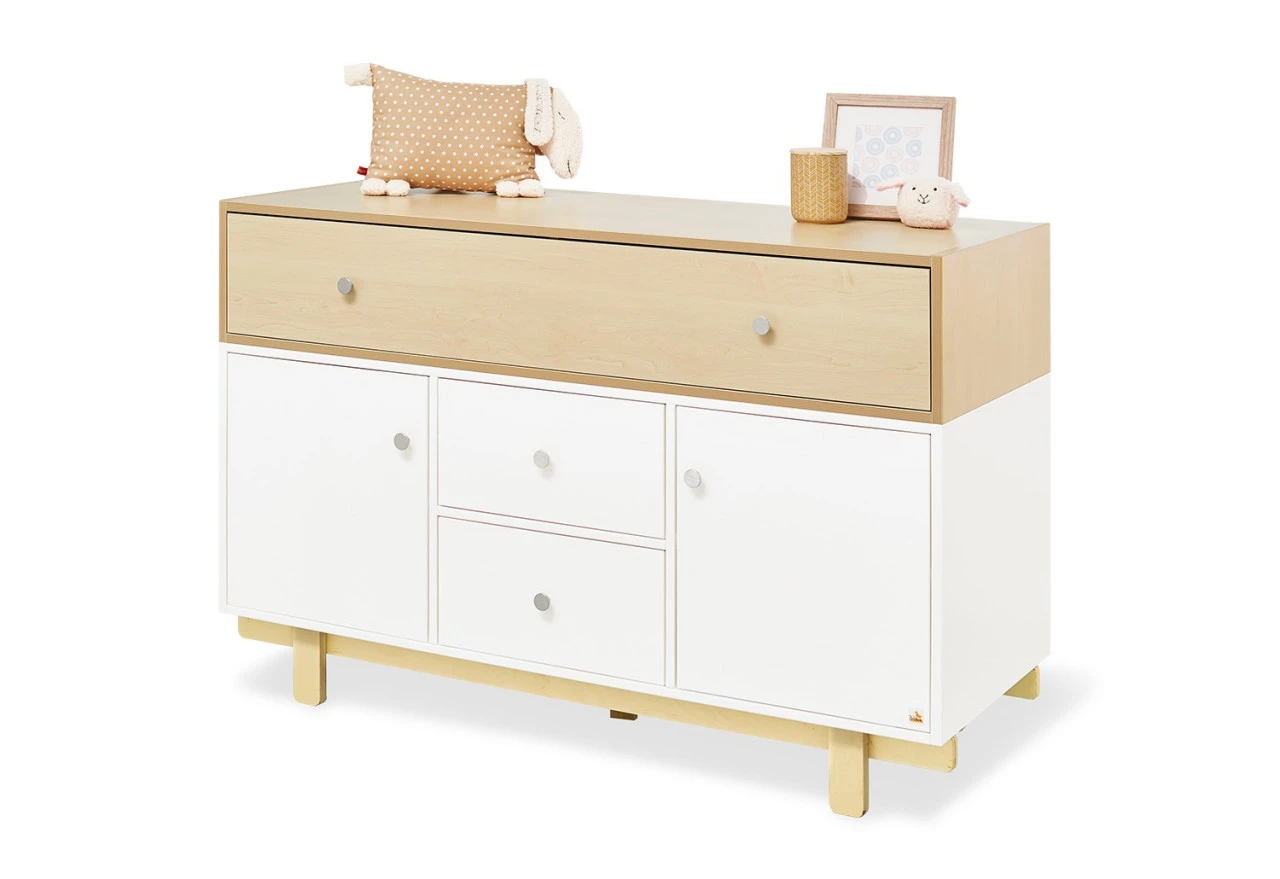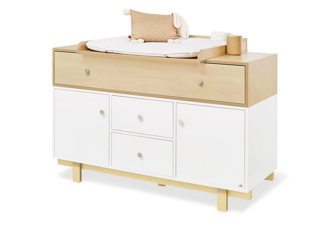 · Extrabreite Wickelkommode mit abnehmbarem Wickelaufsatz, 2 Türen und 3 Schubkästen.