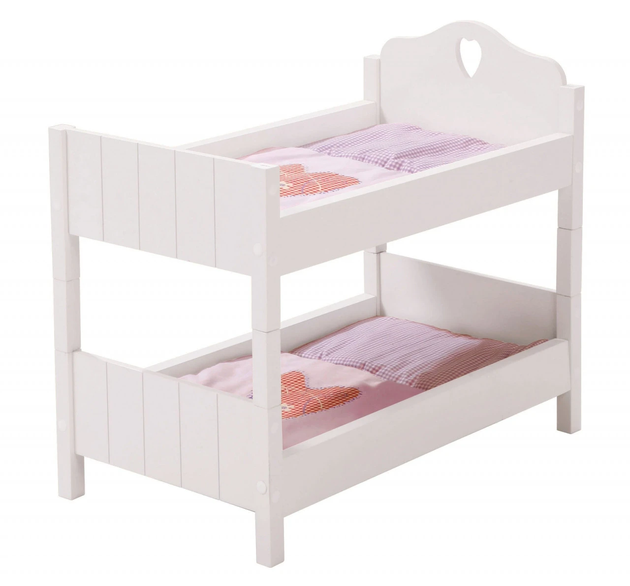 · Das Fienchen Puppenetagenbett, weiß lackiert, im klassischen Landhauslook, bietet genügend Platz für zwei Puppenfreunde oder 2 Babypuppen Ihres Kindes. Das kindgerechte Etagenbett in Weiß für Puppen ist mit zwei Bettwäschen (2x Kissen, 2x Decken) ausgestattet. Die textile Ausstattung ist mit liebevollem Herzmotiv bedruckt und lädt zum fröhlichen Träumen und Kuscheln ein. Das Puppenetagenbett ist teilbar und lässt sich einfach in 2 einzelne Puppenbetten verwandeln.Passend zu diesem wandelbaren Puppenbett gibt es zahlreiches weiteres Puppenzubehör in unserer Fienchen Puppenmöbel Serie, die zum Lernen, Spielen, Sitzen oder einfach zum Liebhaben einladen. Ausstattung Puppenkollektion Fienchen: Herzform und Fräsungen in den Fronten und die liebevolle Bedruckung der Textilien verleihen diesem weiß lackierten Puppenzuhehör ihren zarten Landhauscharakter Das Etagenbett wird zerlegt geliefert. Die Montage ist kinderleicht. Alle verwendeten Materialien sind schadstoffgeprüft und zertifiziert. Zusätzlich werden sie regelmässig während der Herstellung überprüft. Die Oberflächen sind abwischbar und pflegeleicht, die textile Ausstattung ist in der Maschine waschbar.