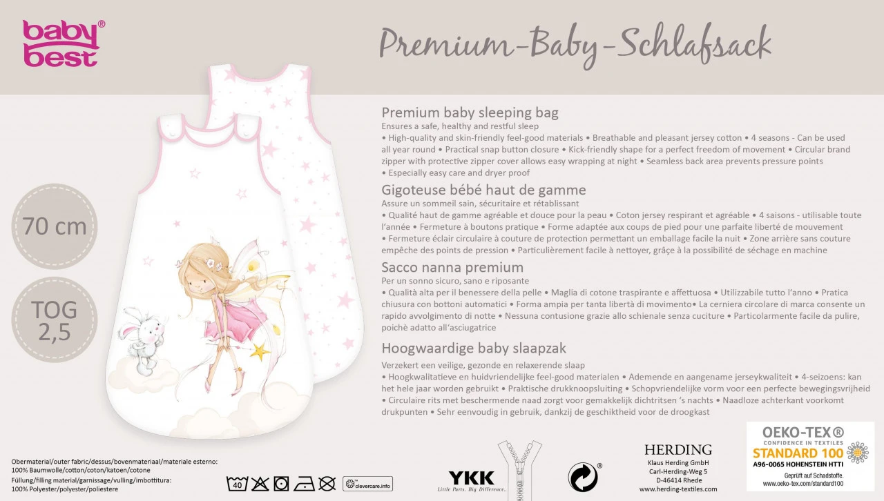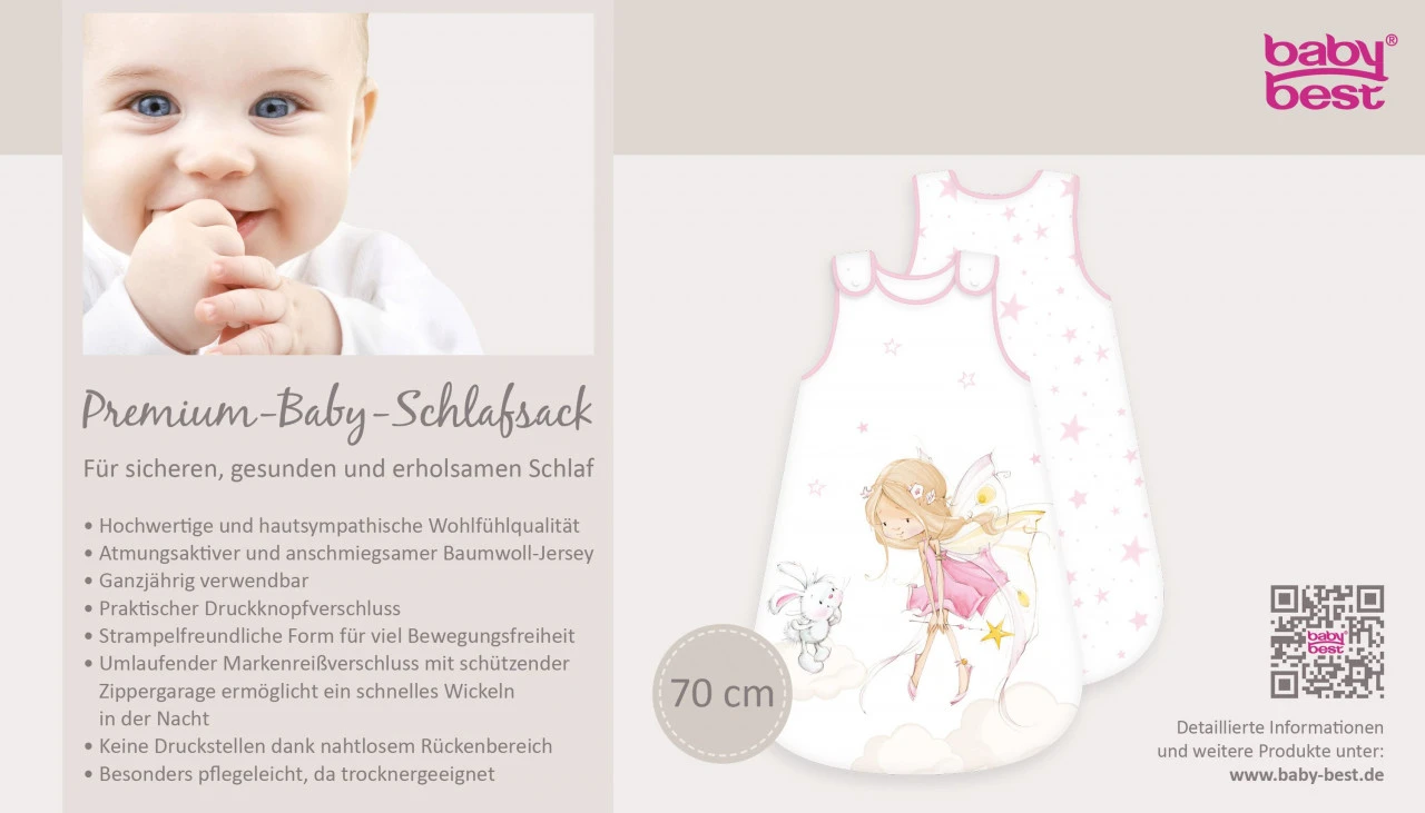 · Der bequeme babybest® Ganzjahres Schlafsack im niedlichen Little Fairy Design garantiert einen ruhigen Schlaf bei Tag und Nacht mit süßen Träumen. Ob im Sommer, Winter, Herbst, oder Frühling sorgt der temperaturausgleichende Schlafsack durch seinen weichen Hals- und Armausschnitt, der strampelfreundlichen Birnenform sowie dem nahtlosem Rückenbereich für optimalen Komfort bei Jungen und Mädchen. Der seitlich, nach unten laufende Reißverschluss mit Zippergarage ermöglicht ein schnelles und einfaches Wickeln. Das Obermaterial aus 100 % Baumwolle und die Füllung aus 100 % pflegeleichtem Polyester sind nach STANDARD 100 by OEKO-TEX® zertifiziert und bieten eine hochwertige, hautsympathische Wohlfühlqualität. –