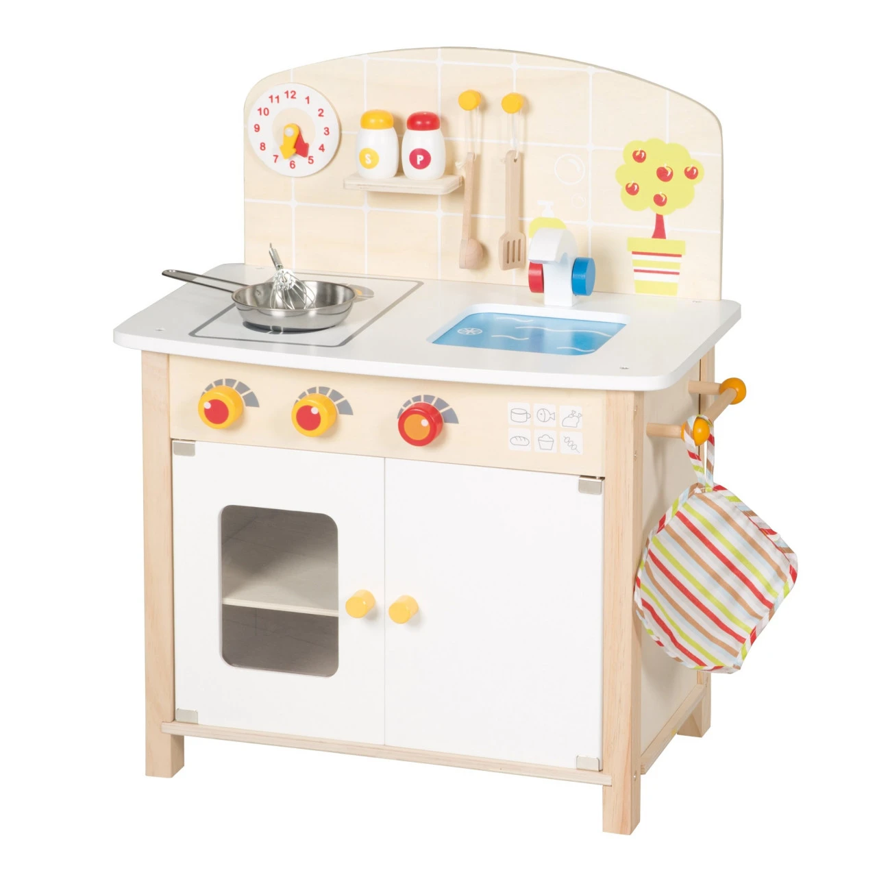 · Die Spielküche ist ein Platzsparwunder. Dennoch kommen kleine Nachwuchsköchinnen und -köche voll auf ihre Kosten. Denn ein wahres Kochtalent entfaltet sein Können selbst in einer kleinen Kinderküche. Der Fantasie sind keine Grenzen gesetzt und Ihr Kind wird beim Zubereiten der selbst ausgedachten Gerichte jede Menge Spaß haben. Die Kinderküche besitzt einen Herd mit 2 aufgedruckten Kochstellen, einen Backofen mit Tür, ein Schränkchen und eine Spüle inkl. Wasserhahn mit 2 Deko Knöpfen. Wie in einer echten Küche lassen sich die 3 Knöpfe für Platten und Ofen drehen. Durch das durchsichtige Fenster am Backofen kann Ihr Kind das Bratgut oder den Kuchen im Auge behalten. Mithilfe der Uhr und deren drehbaren Zeigern, wird auch das Lernen von Uhrzeiten spielerisch gefördert. Die liebevolle Bedruckung mit Fließen, Kochstufen, Pflanzen und Seifenspender lässt die Kinderküche zum Hingucker werden. Die geräumige Spielzeugküche inklusive Schrank und diversen Aufhängungsmöglichkeiten an der Küchenwand und -seite bietet jede Menge Stauraum. So finden Kaufladen-Lebensmittel und das mitgelieferte umfangreiche Küchenzubehör (Metallpfanne, Schneebesen, Kochlöffel, Pfannenwender, Geschirrtuch, Salz- und Pfefferstreuer) in der Spielzeug-Küchenzeile ihren Platz. Dem sofortigen Spielstart steht also nichts mehr im Wege! Die Kinderspielküche wird zerlegt geliefert. Die Montage ist kinderleicht. Die Spielküche wurde nach der europäischen Sicherheitsnorm für Spielzeug EN 71 in Deutschland entwickelt. Alle verwendeten Materialien sind nach EN 71-1:2014 schadstoffgeprüft und zertifiziert und werden auch während der Herstellung regelmäßig geprüft. Die Oberflächen sind abwischbar und pflegeleicht. Die hat die Maße 63x52x30 cm (HxBxT). Die Spielküche eignet sich für kleine Hobbyköchinnen und -köche ab 36 Monaten.