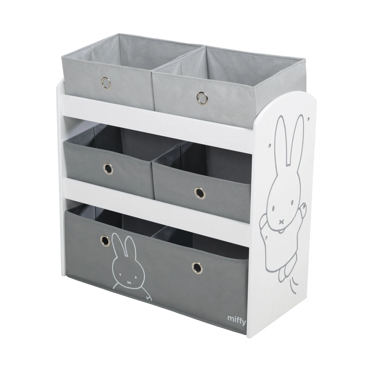 · Das Spielregal Miffy aus lackiertem und bedrucktem MDF ist sowohl ein idealer Ordnungshüter als auch ein toller Blickfang im Kinderzimmer. Ein Regal ist ein nützliches und sinnvolles Möbelstück um ein Kinderzimmer perfekt einzurichten. Mit 5 Stoffboxen ausgestattet, bietet das Aufbewahrungsregal ausreichend Stauraum für loses Spielzeug wie Bauklötze oder Malsachen. Mit dem Spielregal lernen schon die Kleinsten Ordnung im Kinderzimmer zu halten. Dank der großen Metall-Griffösen lassen sich die Stoffboxen leicht herausnehmen und wieder zurück ins Spielzeugregal stellen. Die unterste und größte Stoffbox ist, passend zum Druckmotiv auf den Seitenteilen des Aufbewahrungsregals, mit einem niedlichen Miffy-Häschen bedruckt. Mit 5 Stoffboxen (4 Boxen mit den Maßen 30 x 24 x 15 cm (LxBxH), 1 Box mit den Maßen 60 x 24 x 20 cm (LxBxH). Gesamtmaß Regal: 63,5 x 30 x 60 cm (LxBxH).