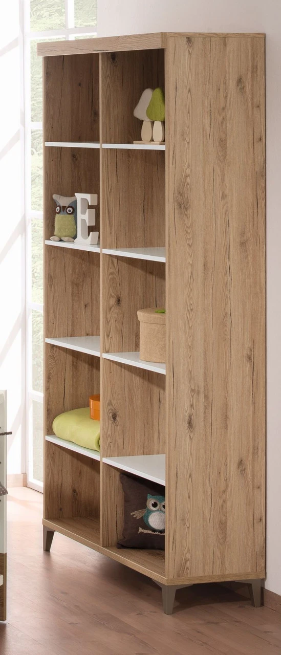 Das Standregal REMO von PAIDI bietet Platz für Spielzeug, Bücher und Zubehör im Kinderzimmer. Natürlich-schöne Akzente im Kinderzimmer werden durch die Kombination aus Dekor Bordeaux-Eiche Nachbildung und kreideweißem Dekor geschaffen. Das Regal bietet eine praktische Unterteilung mit 10 offenen Fächern.