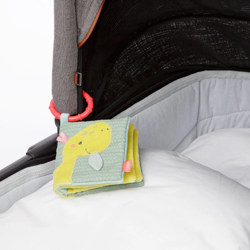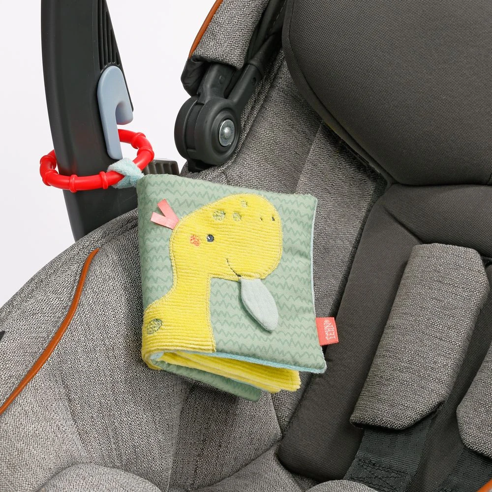 · Das Stoffbuch aus der Happy Dino Kollektion lädt das Baby dazu ein die zauberhafte Welt der Dinosaurier zu entdecken. Dino Diego, die niedliche Sonne, eine Wolke, ein Dino-Ei und der feuerspeiende Vulkan bereiten sicher ganz viel Freude beim Blättern und Erkunden. Die versteckte Quietsche, das Raschelpapier und der Spiegel fördern spielerisch Babys Greif- und Tastsinn, die Fantasie und die Selbsterkennung. Dank des Befestigungsrings ist das Stoffbuch Dino perfekt für zuhause und unterwegs geeignet.