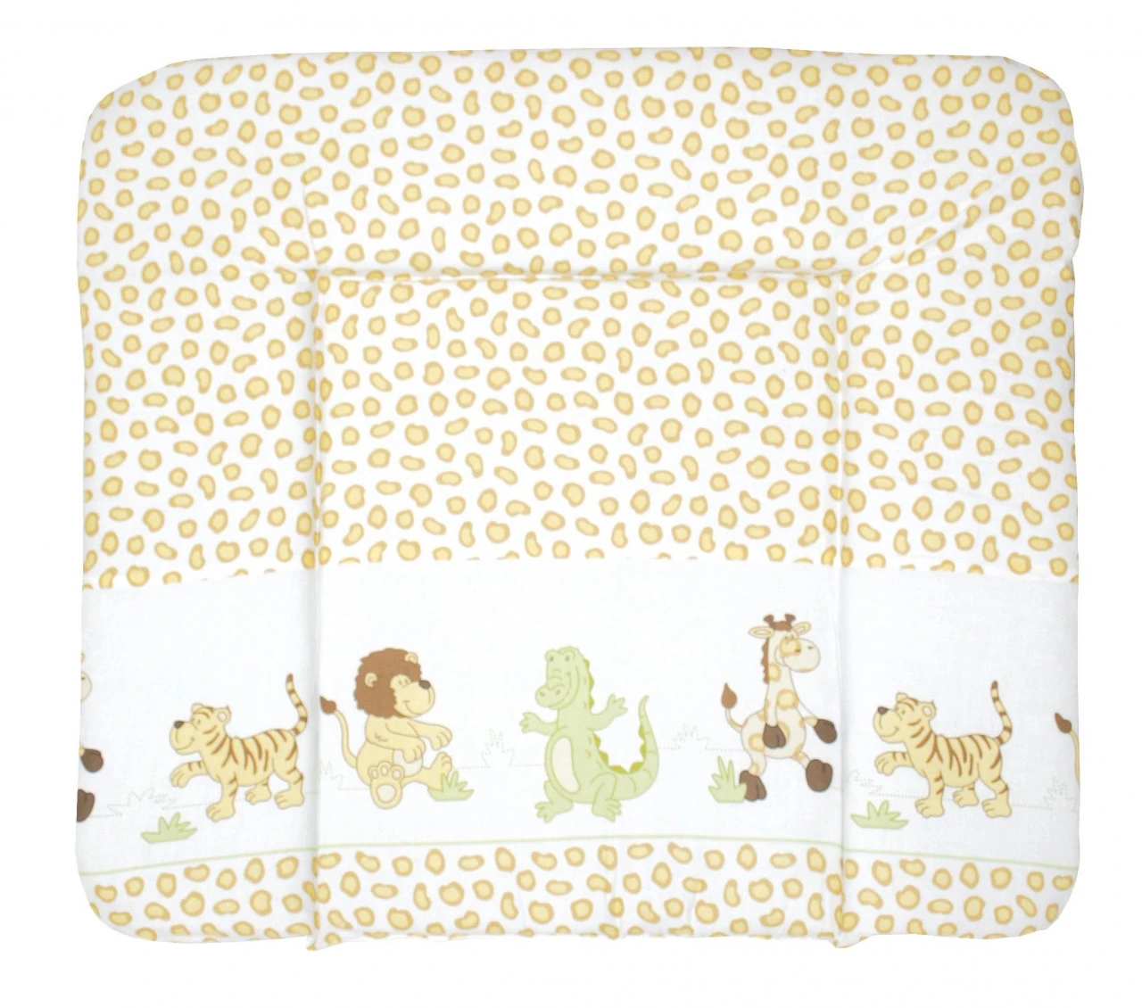 · Mit dieser weichen Wickelauflage lädt der Zauber Afrikas mit Tiger, Löwe, Giraffe und Krokodil die Kleinsten in eine bunte Safariwelt ein. Auf dieser Unterlage liegt Ihr Nachwuchs beim Wickeln und Pflegen bequem! Der Oberflächenstoff ist besonders hautfreundlich und anschmiegsam für Ihr Baby. Wickelunterlage aus Baumwollpolyestergemisch und phtalatfreier PU-Beschichtung. Die Wickelauflage ist für komfortables und bequemes Liegen beim Wickeln und Pflegen weich gepolstert. Der 3-seitig erhöhte Rand sorgt für mehr Sicherheit und Geborgenheit. Die Maße 85 x 75 cm, Höhe ca. 4 cm, sind an die meisten Standardwickelkommoden angepasst. Die Oberfläche der Wickelunterlage ist abwischbar und pflegeleicht. Alle verwendeten Materialien sind schadstoffgeprüft und zertifiziert. Zusätzlich werden regelmäßig während der Herstellung überprüft. Sie sind 100% PVC- und phthalatfrei.