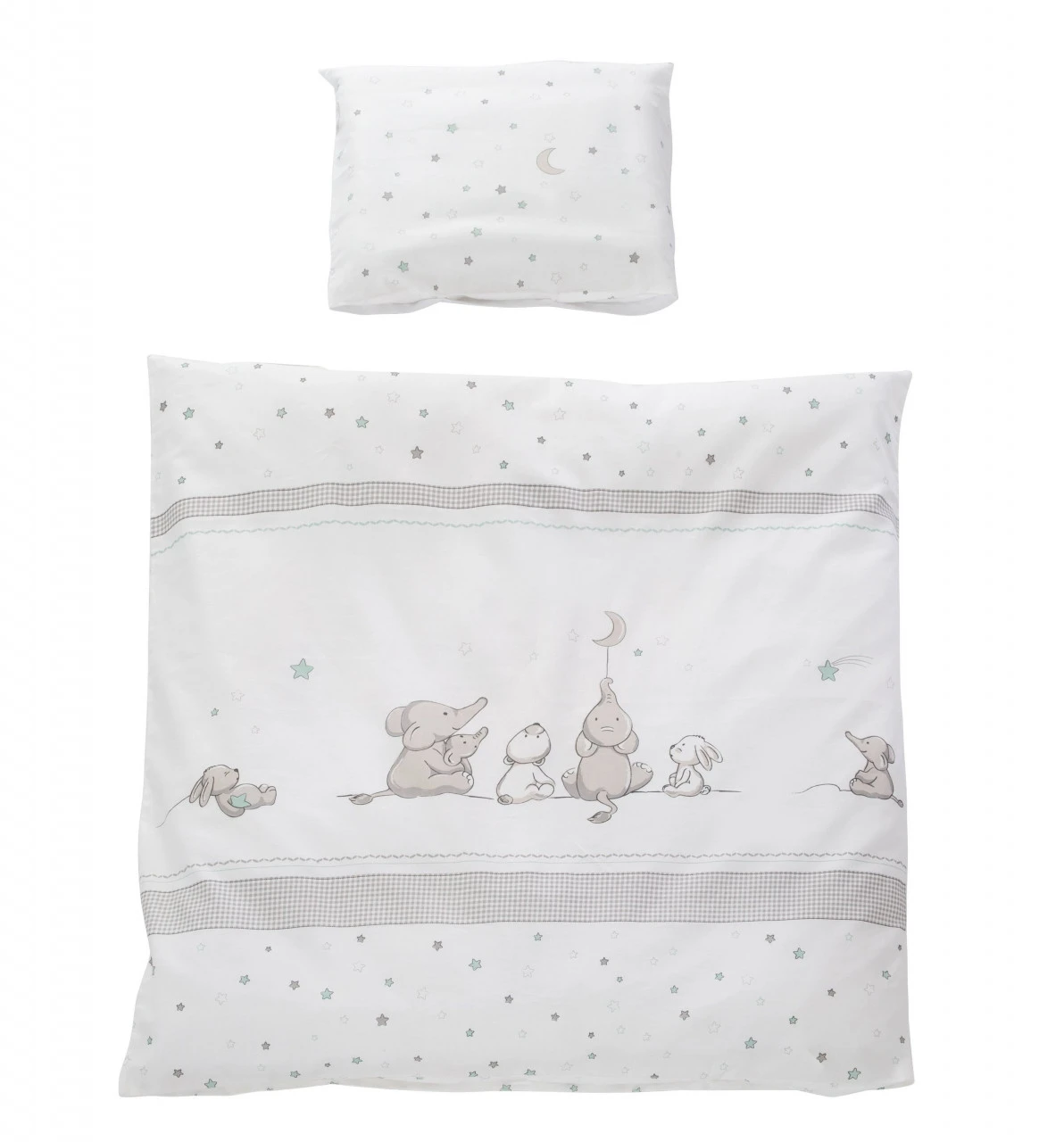 · Diese 2-teilige Wiegenbettwäsche aus der Kollektion Sternenzauber ist im oberen und unteren Bereich der Bettdecke mit einem bezaubernden Sternenhimmel in grau, weiß und mintfarben bedruckt. In der Mitte der Bettwäsche erzählen sich Häschen, Bär und Elefanten eine Gute-Nacht-Geschichte, während sie den Sternenhimmel bewundern. Die roba Wendebettwäsche ist ein Highlight im Babyzimmer. Die hochwertige 2-teilige Wiegenbettwäsche besteht aus einem Kissenbezug 40 x 35 cm und einem Bettbezug 80 x 80 cm und ist aus hautfreundlicher und atmungsaktiver Baumwolle gefertigt. Die Wiegenbettwäsche sorgt für ein gesundes Schlafklima und garantiert besten Schlafkomfort. Alle verwendeten Materialien der Wendebettwäsche sind schadstoffgeprüft und zertifiziert. Zusätzlich werden sie regelmäßig während der Herstellung überprüft. Das Wiegenset aus 100% Baumwolle ist in der Maschine waschbar und trocknergeeignet. Zu diesem 2-teiligen Wiegenset gibt es weitere wunderschöne Accessoires aus der Kollektion Sternenzauber.